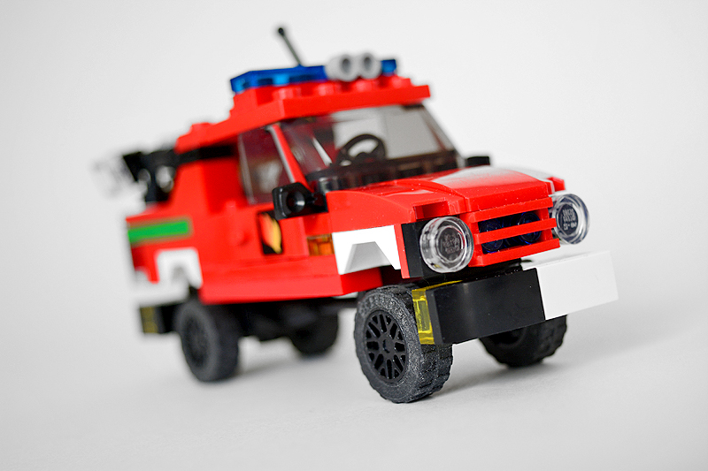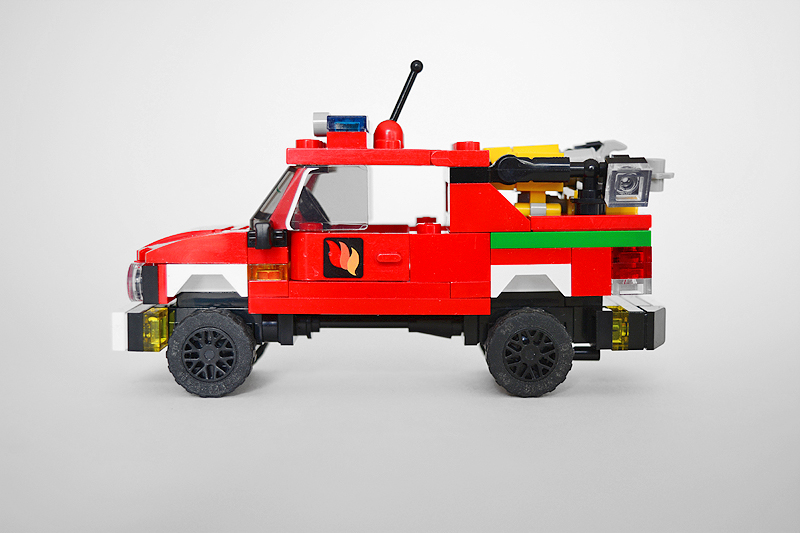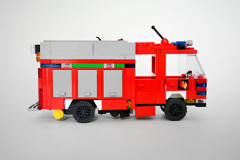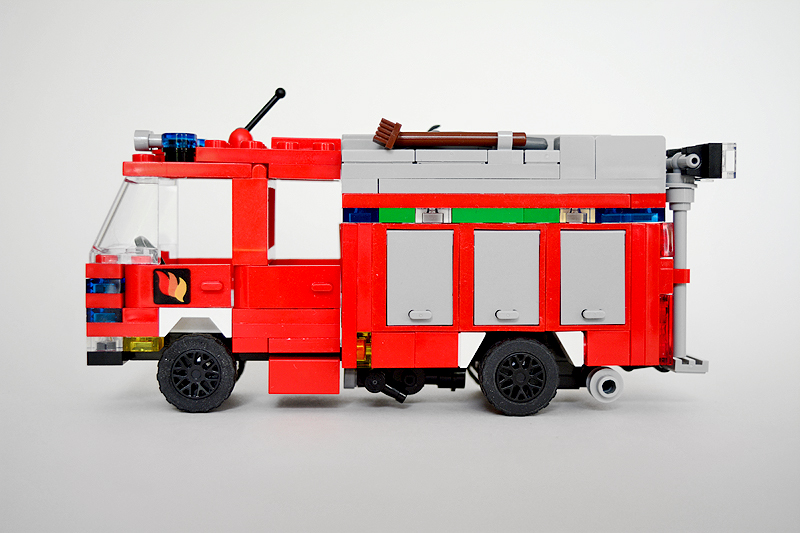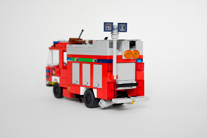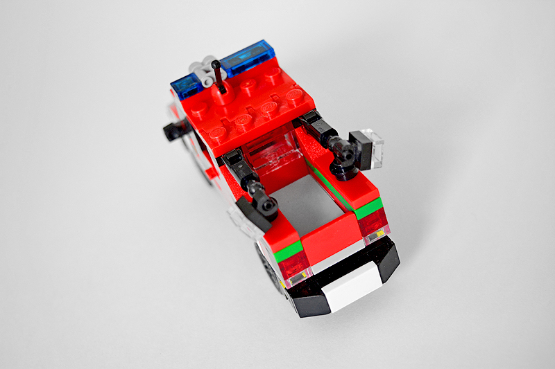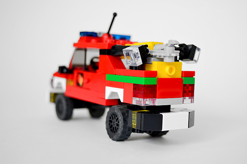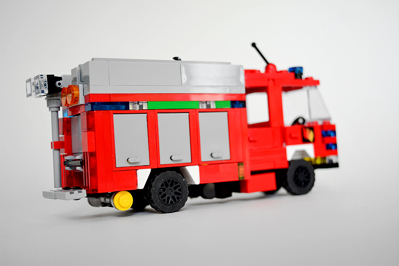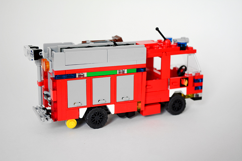 Jedenfalls ist dieses Fahrzeug tatsächlich etwas niedriger, als das oben verlinkte LF 20-KatS – im Modell um eine Plattenstärke bei der Karosserie und bei der Dachbeladung sogar etwas mehr als das. Somit ist also die Annahme der niedrigen Bauart im direkten Vergleich auch im Modell sichtbar. Tatsächlich stand für den Bau des Fahrzeugs auch das ältere LF-KatS Pate. Selbst die Fahrgestellanbauteile unter dem Fahrzeug gleichen sich. Allerdings flossen auch hier einige Optimierungen zugunsten der Stabiltät und der Festigkeit des Aufbaus mit ein. Am Ende entstand ein optischer, wenn auch nicht unbedingt eineiiger Zwilling.