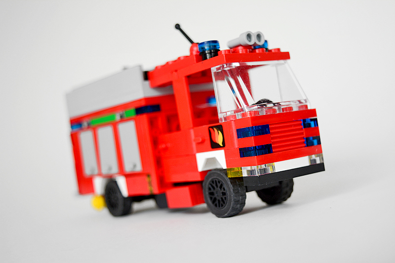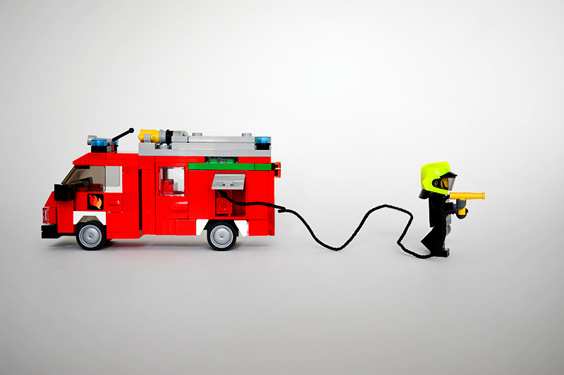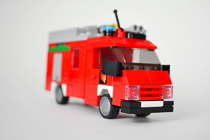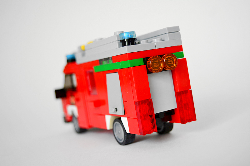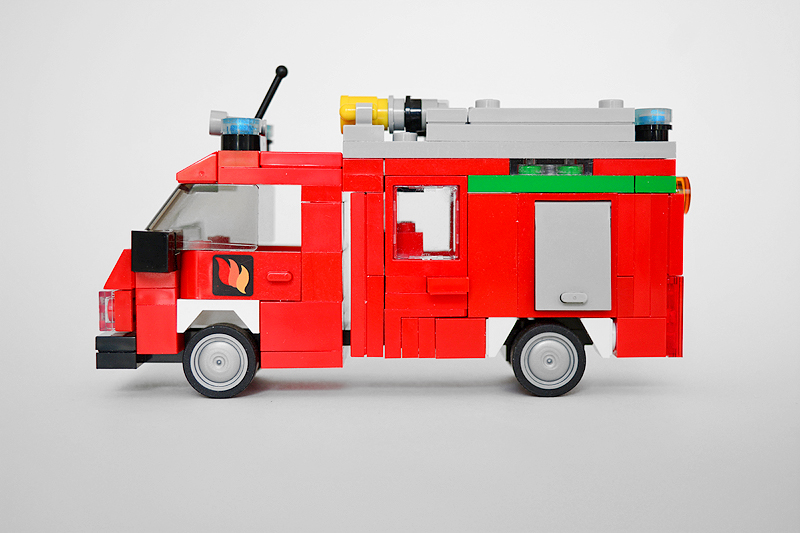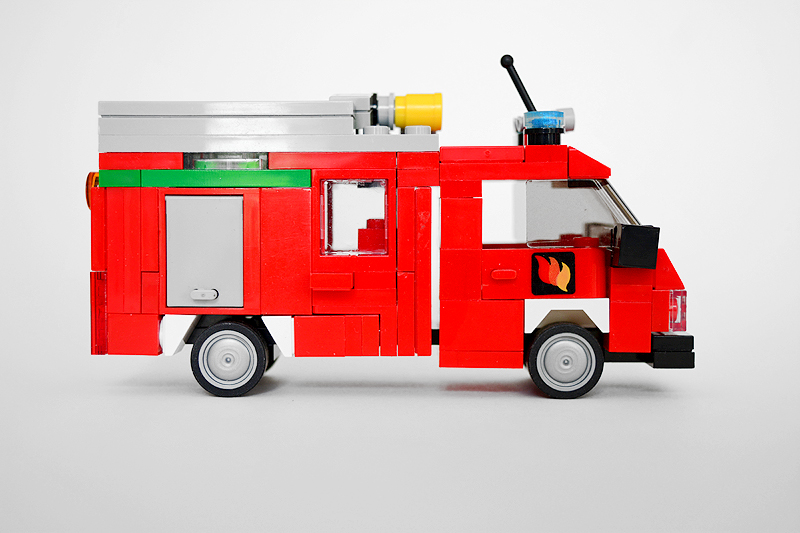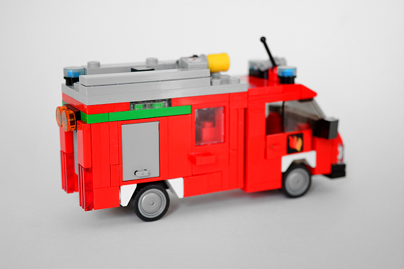 Die Kleintransporterbasis, die im Original vom Modellbauer de-marco erdacht wurde, erfreut sich bei mir immer größerer Beliebtheit. Somit erwächst hier ein Mitbewerber-Modell zu den bisherigen sehr vielfältig eingesetzten Sprinter-artigen Kleintransportern. Etwas Hirnschmalz samt zahlreicher Bauversuche benötigte die Einarbeitung der aufrecht stehenden Bauteile der Tür samt Fenster zum Mannschaftabteil, da der Rest des Aufbaus um 90 Grad gekippt montiert ist. Kniffelig insofern, als dass zwischen Manschaftskabine und dem Rest des Aufbaus kein Spalt die rote Fläche stören sollte. Die schmale Lücke zwischen Kabine und Aufbau ist hingegen gewollt.