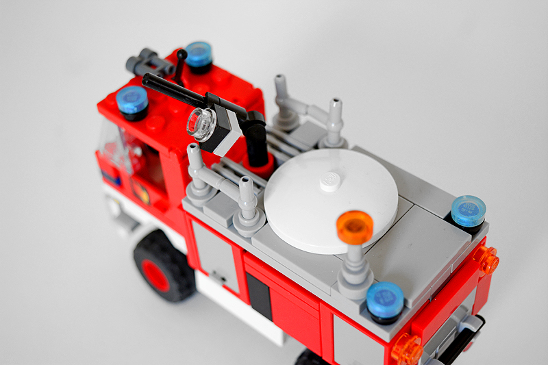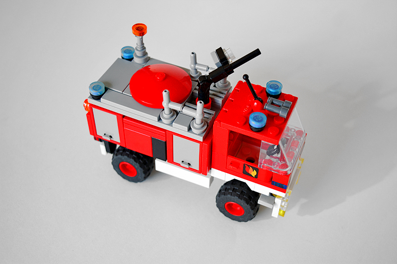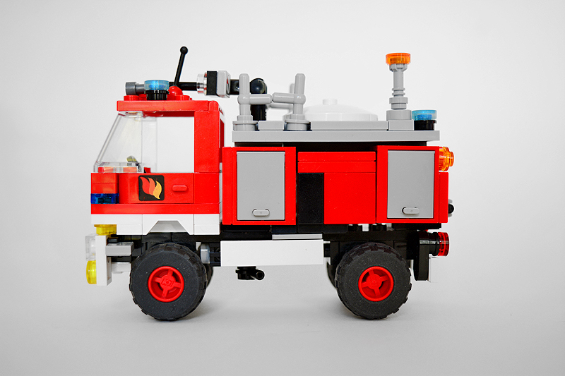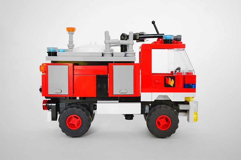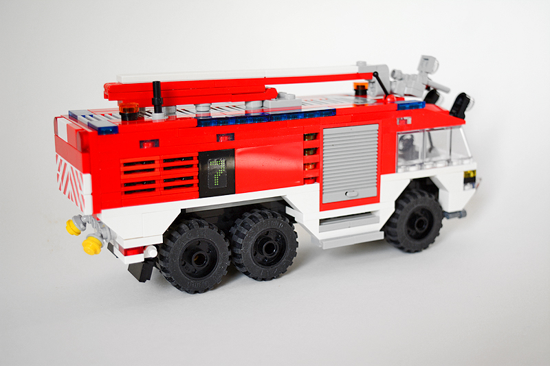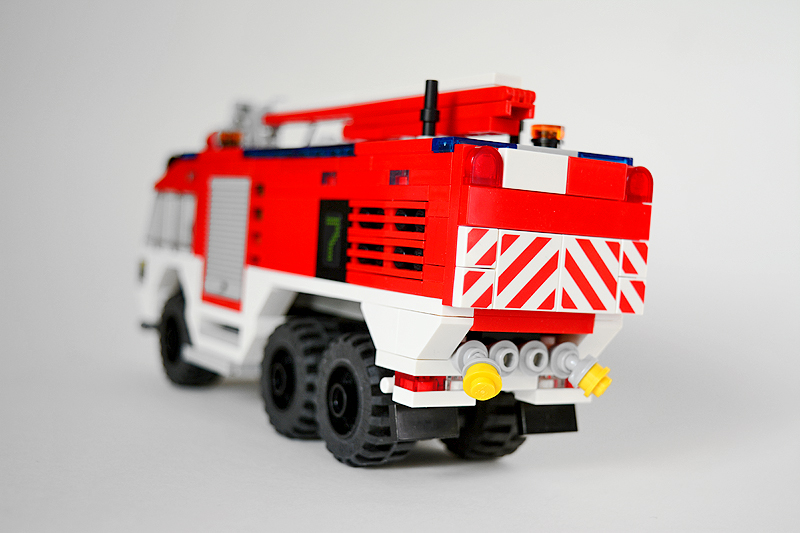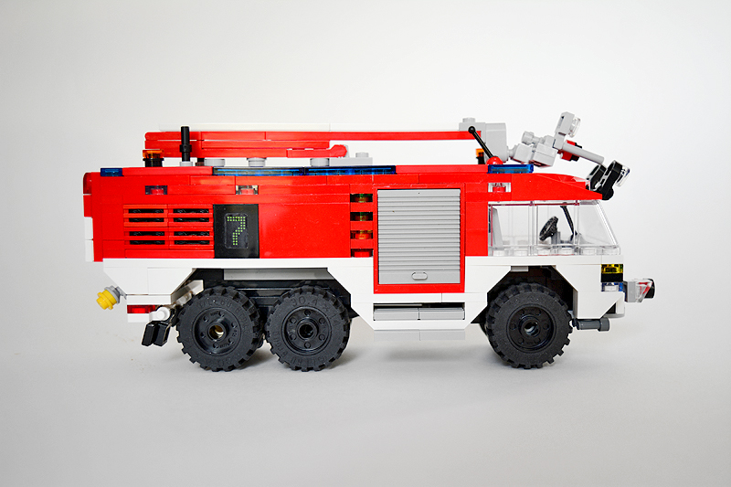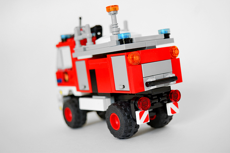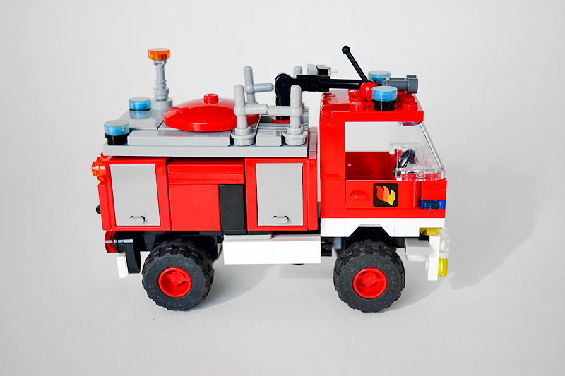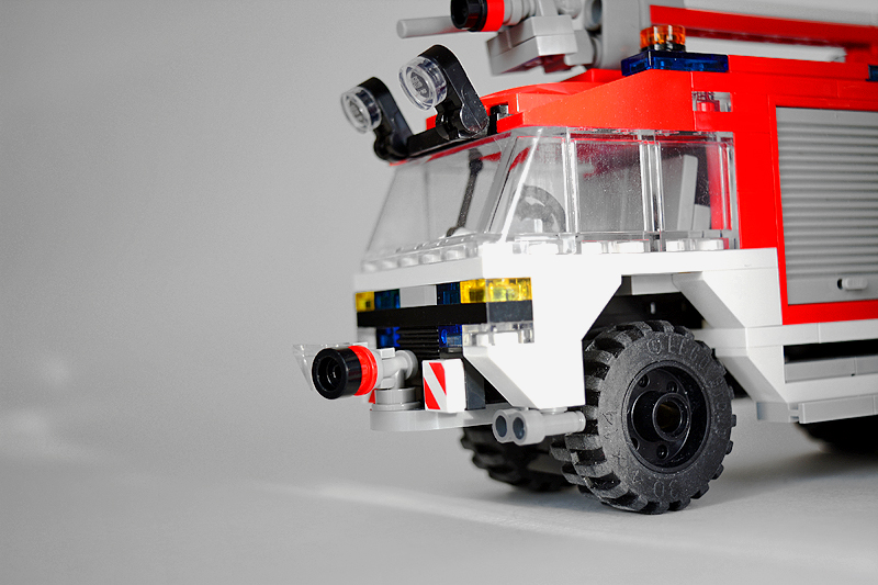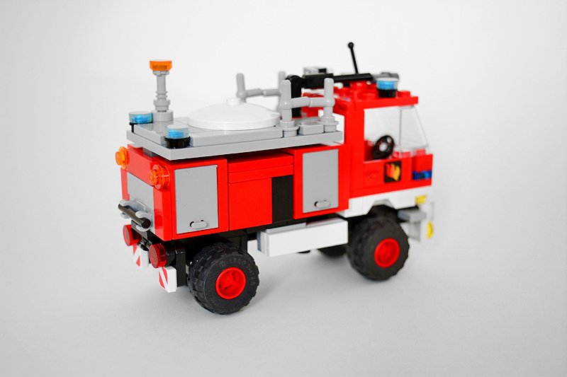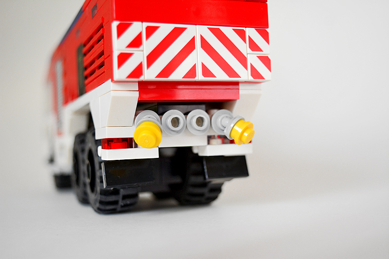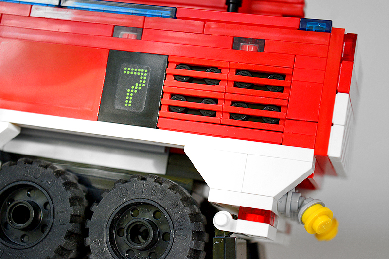 So erfolgte auch meine Umsetzung formensprachlich sachlicher gehalten ins Farnheimer Universum. Der Bau startete mit dem vorderen Radauschnitt und arbeitere sich langsam nach hinten und oben. Das Reifengröße stand schn früh fest und im Grunde auch der Radstand. So musste sich also „nur“ die Karosse nur drumherum bauen lassen. Trotzdem war es ein gehöriges Stückchen Arbeit bis das Auto, so wie hier, fertig auf dem Bautisch stand – und vor allem stabil war. Wenn man nämlich keinen Bauplan vorliegen hat, den man abarbeiten kann, sondern freestyle baut, fängt man immer irgendwo an. Während des Entstehungsprozesses war es so, dass die Kabine über eine lange Zeit keinen Boden verfügte und sich daher nur schlecht mit dem Fahrgestell verbinden ließ. Entsprechend labil war die gesamte Angelegenheit. Immer wieder zerlegte ich das Modell eher unfreiwillig mit ungeschickten Handgriffen. So mussten immer wieder rückgebaut und zahlreichen Querverstrebungen eingezogen werden, um die nötige Stabilität zu erreichen. Auch übernimmt das Fahrzeugdach stabilisierende Aufgaben. Im Inneren sorgen eingezogene Querverbindungen, insbesondere vor und hinter Geräteraumsegment für strukturellen Halt und Verwindungssteifigkeit. Dabei hilft tatsächlich auch der Innenausbau des Gerätefachs. Nach Abschluss der Arbeiten verfügt das Modell nun über eine hinreichende Festigkeit. Details wie ein neuer Löscharm, Frontwerfer und die neuen, diagonal gestreiften 1x1er und 2x2er Fliesen runden im Wesentlichen das Modell, das nun das größte meiner gesamten Flotte ist, ab.