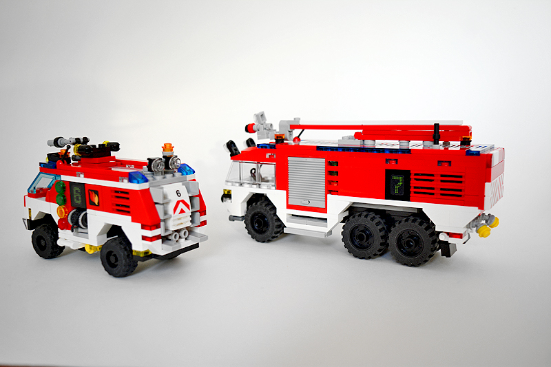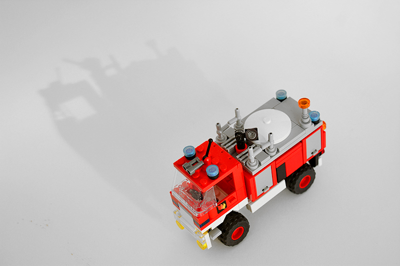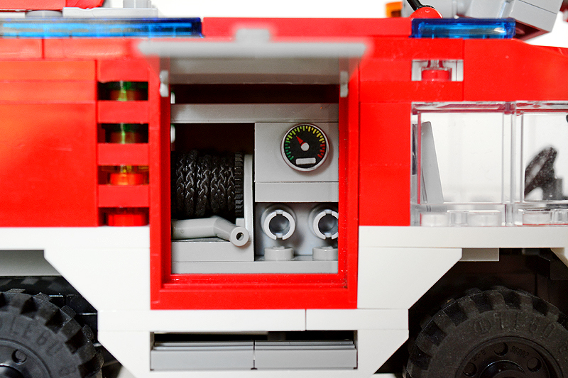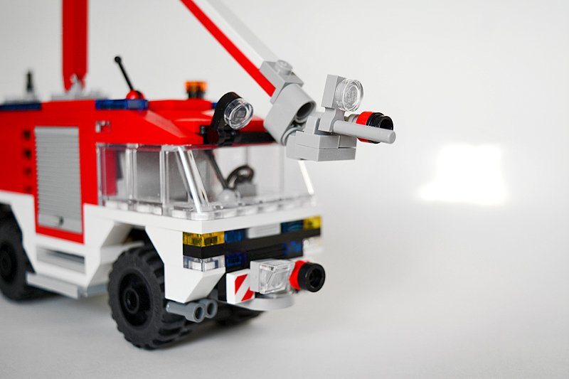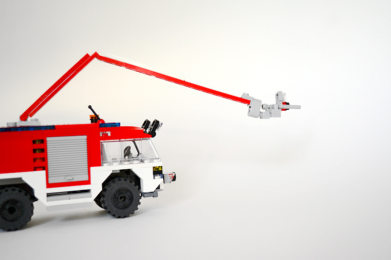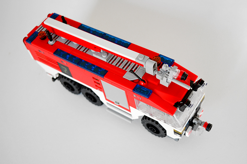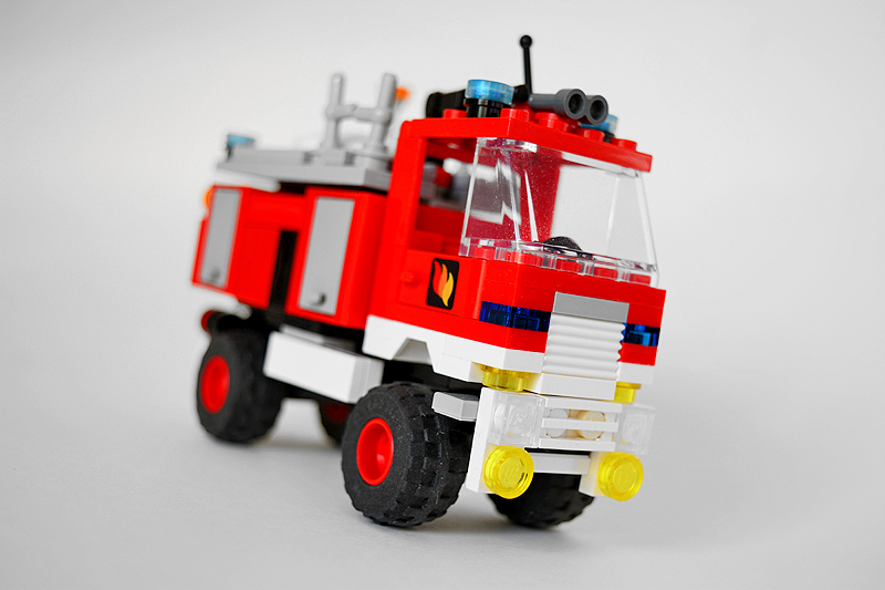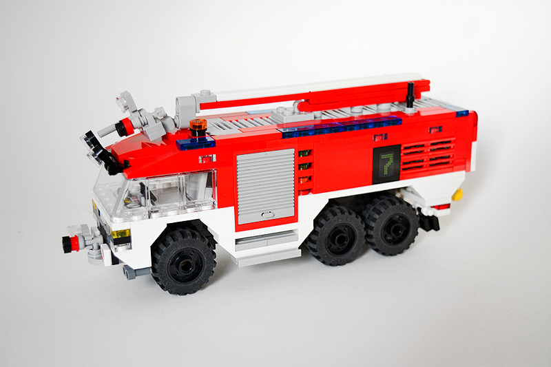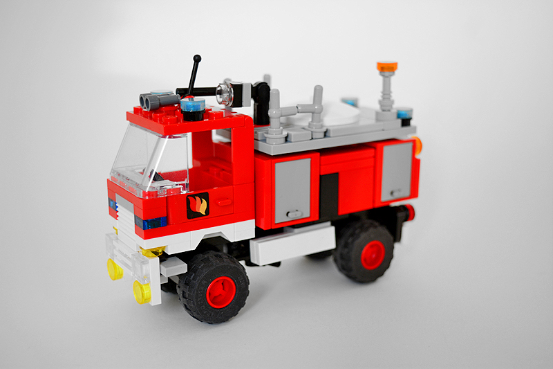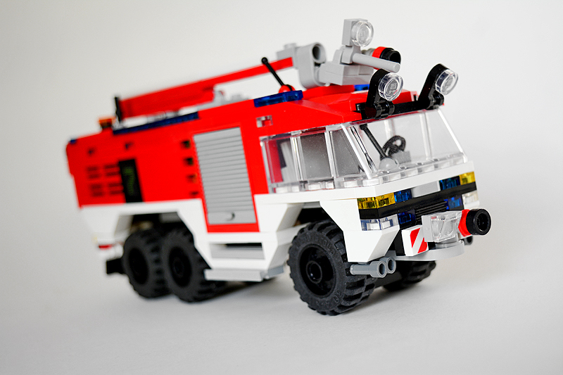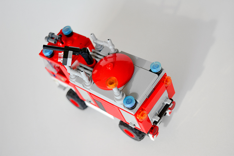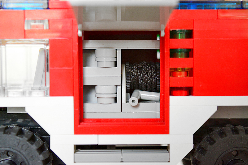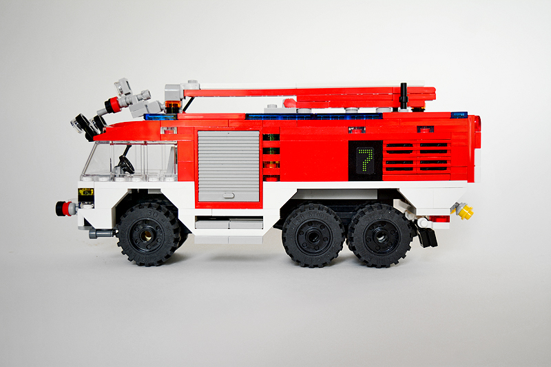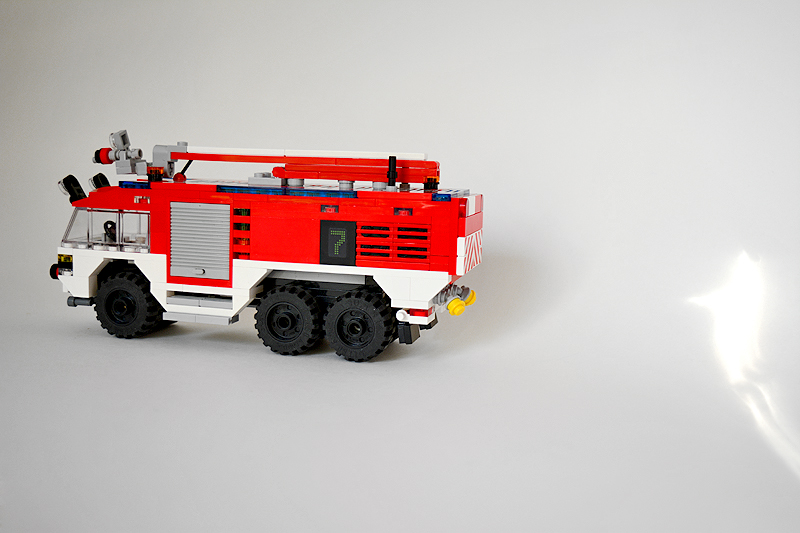 So erfolgte auch meine Umsetzung formensprachlich sachlicher gehalten ins Farnheimer Universum. Der Bau startete mit dem vorderen Radauschnitt und arbeitere sich langsam nach hinten und oben. Das Reifengröße stand schn früh fest und im Grunde auch der Radstand. So musste sich also „nur“ die Karosse nur drumherum bauen lassen. Trotzdem war es ein gehöriges Stückchen Arbeit bis das Auto, so wie hier, fertig auf dem Bautisch stand – und vor allem stabil war. Wenn man nämlich keinen Bauplan vorliegen hat, den man abarbeiten kann, sondern freestyle baut, fängt man immer irgendwo an. Während des Entstehungsprozesses war es so, dass die Kabine über eine lange Zeit keinen Boden verfügte und sich daher nur schlecht mit dem Fahrgestell verbinden ließ. Entsprechend labil war die gesamte Angelegenheit. Immer wieder zerlegte ich das Modell eher unfreiwillig mit ungeschickten Handgriffen. So mussten immer wieder rückgebaut und zahlreichen Querverstrebungen eingezogen werden, um die nötige Stabilität zu erreichen. Auch übernimmt das Fahrzeugdach stabilisierende Aufgaben. Im Inneren sorgen eingezogene Querverbindungen, insbesondere vor und hinter Geräteraumsegment für strukturellen Halt und Verwindungssteifigkeit. Dabei hilft tatsächlich auch der Innenausbau des Gerätefachs. Nach Abschluss der Arbeiten verfügt das Modell nun über eine hinreichende Festigkeit. Details wie ein neuer Löscharm, Frontwerfer und die neuen, diagonal gestreiften 1x1er und 2x2er Fliesen runden im Wesentlichen das Modell, das nun das größte meiner gesamten Flotte ist, ab.