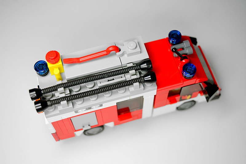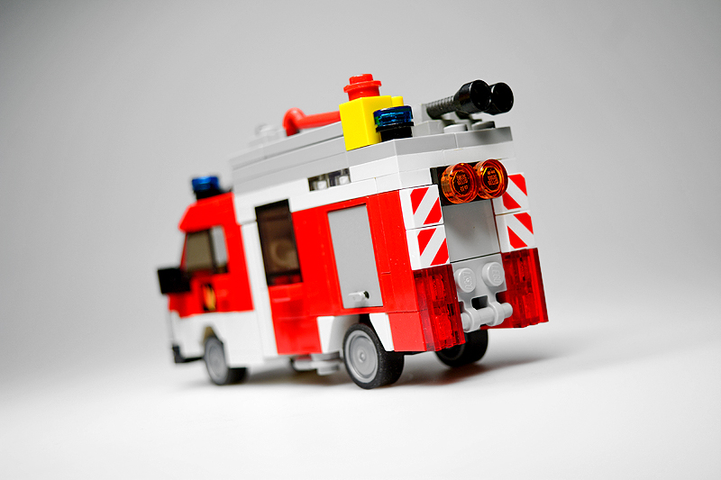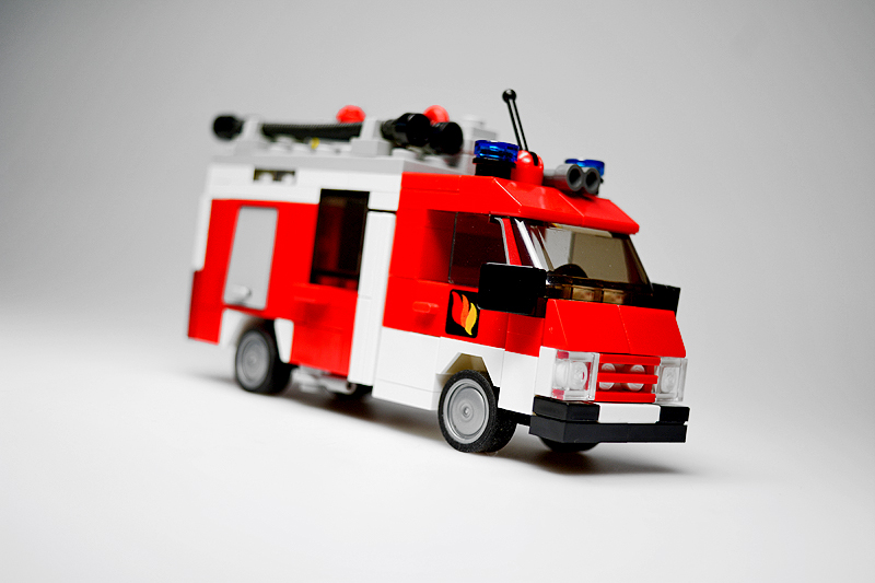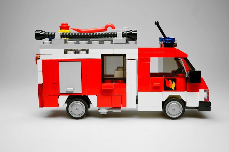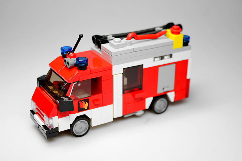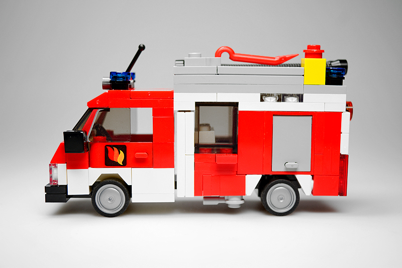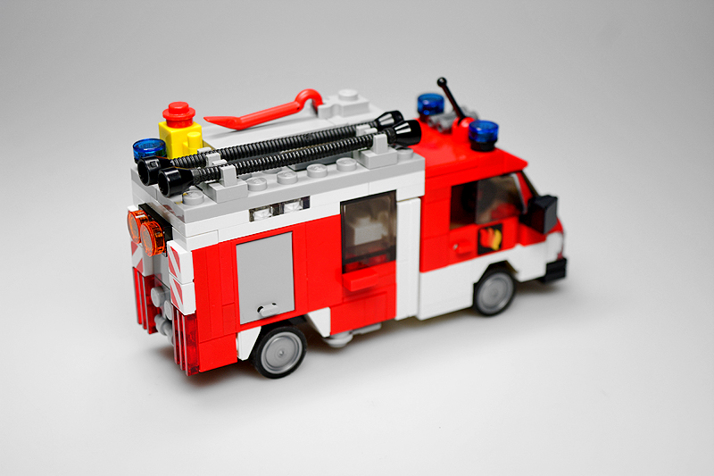 Ich betrieb hierbei sog. „Fahrzeug-Recycling“. Ein mittlerweile 10 Jahre altes Rüstwagen-Modell bekam hierfür die Chance auf eine optische Aufwertung. Die Kabine blieb zwar im Wesentlichen erhalten, allerdings verpasste ich dem Aufbau ein kräftiges „Make-over“. So sind die Gerätefächer nun auf demselben Höhenniveau, und das Heck versah ich mit einer Diagonal-Schraffierung sowie einer Jalousie-Attrappe. Das Fahrgestell selbst erhielt einige zusätzliche Details, wie kleine Gerätefächer und einen Antriebsstrang. Dabei schrumpfte sogar der Radstand um eine Noppe. Die Dachladung wurde den Inselbedürfnissen mittels eines Reservereifens angepasst. Und zu guter Letzt erstrahlt das fertige Modell selbstverständlich auch in demselben Farbkleid wie die anderen Sanderooger – von wegen Einhaltung des Corporate Designs und so.