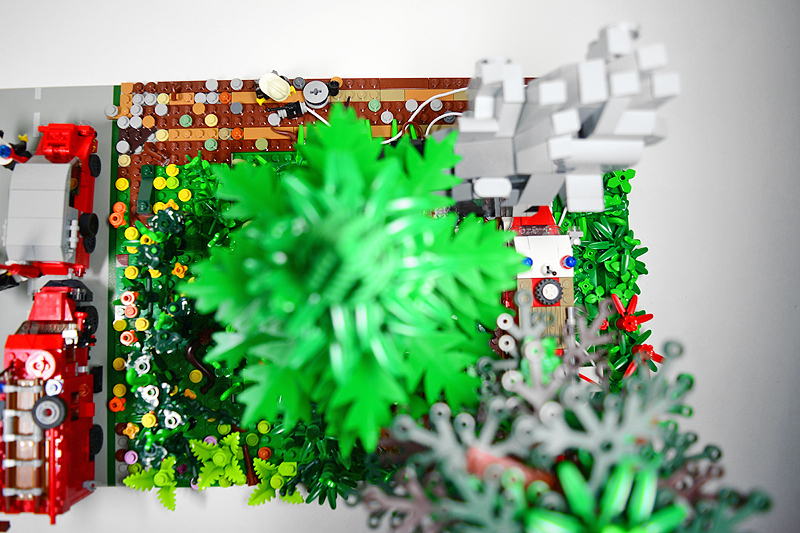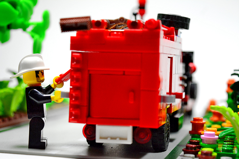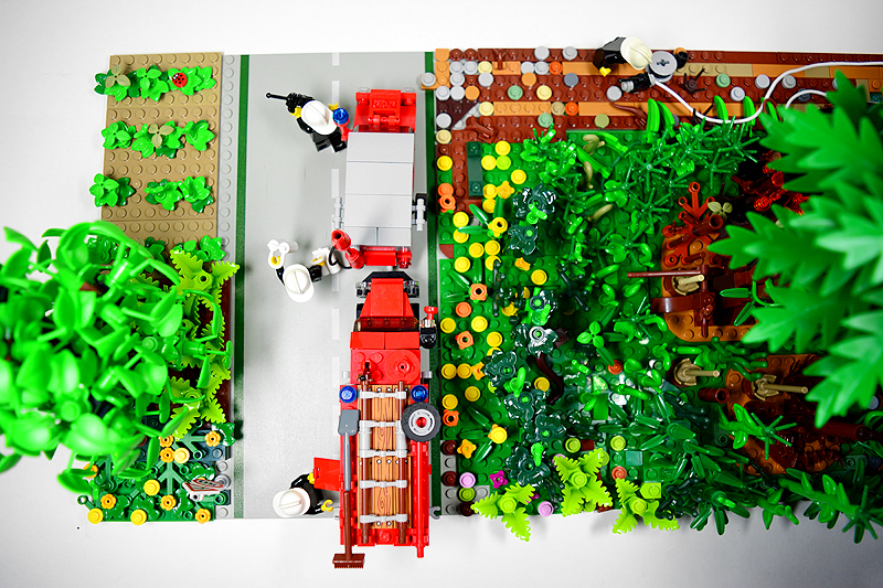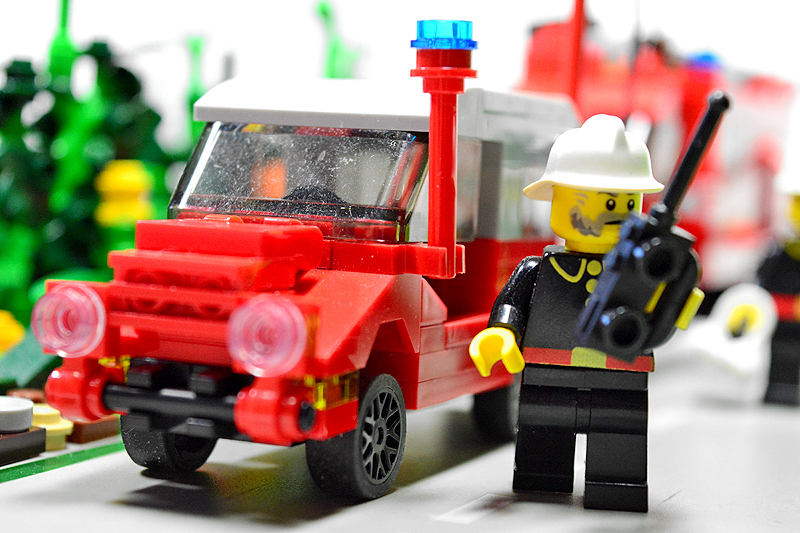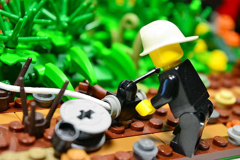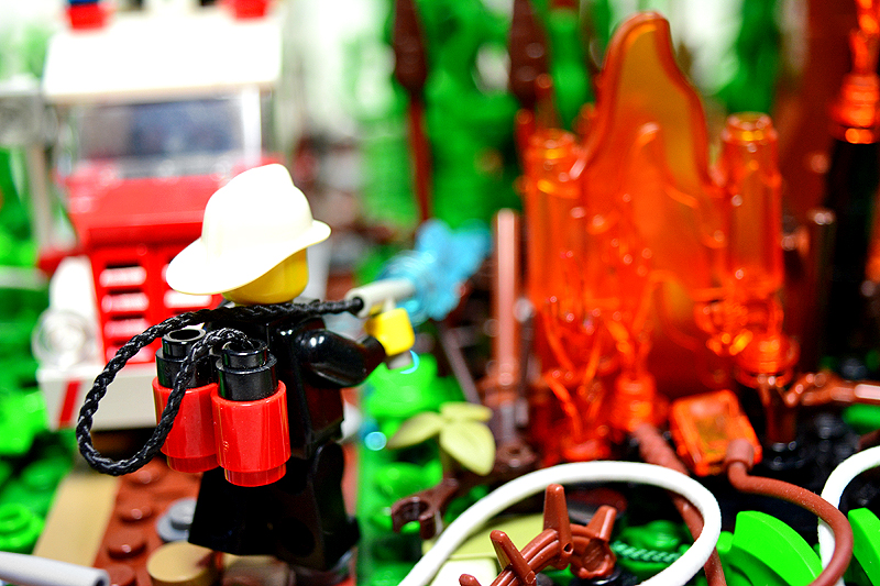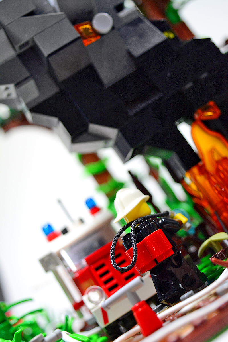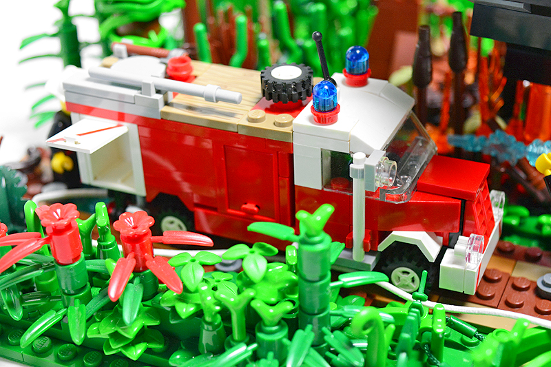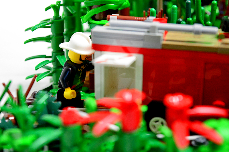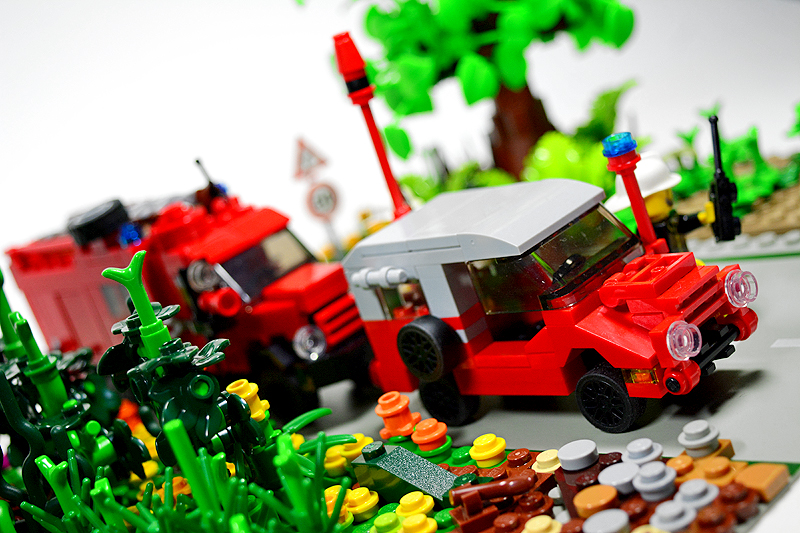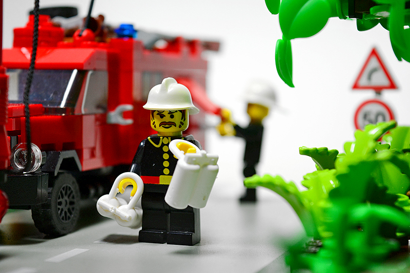 Genau diesen fehlenden Sichtkontakt wollte ich, wegen der kurzen Distanz im Modell, über einen üppigen Bewuchs am Straßenrand erreichen. Was durchaus funktioniert, wenn man sich als Betrachter auf Augenhöhe der Minifigs begibt. Jede von ihnen ist mit einer Aufgabe betreut: eine Figur kümmert sich um die Wasserversorgung, der Maschinist überwacht den Betrieb der Pumpe Im Heck des TLF 8 im Wald und an der Straße macht man sich indes für Löschmaßnahmen bereit, während der Zugführer die zuständige Leitstelle zu erreichen versucht.