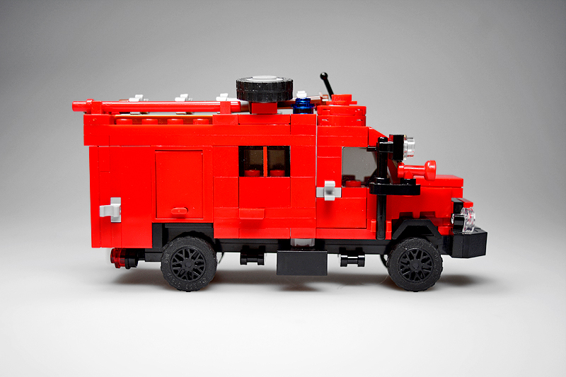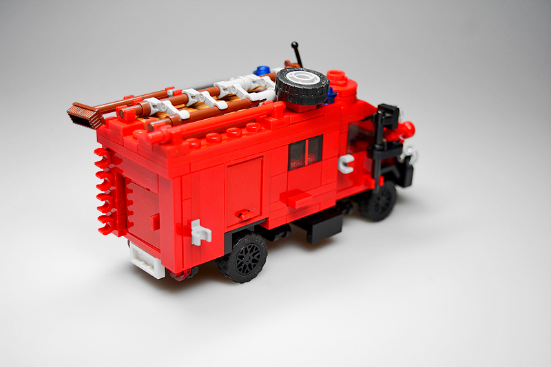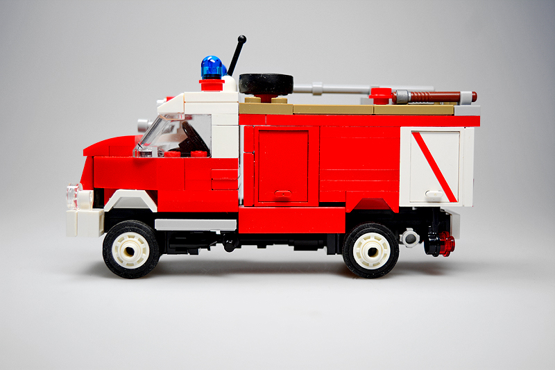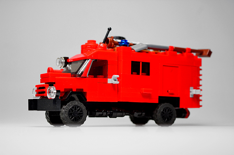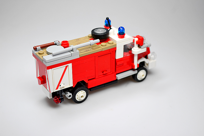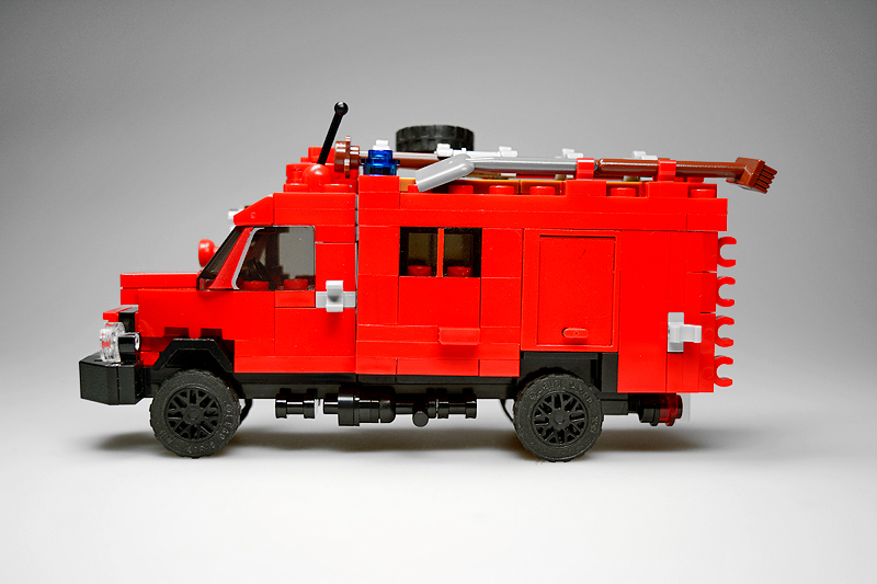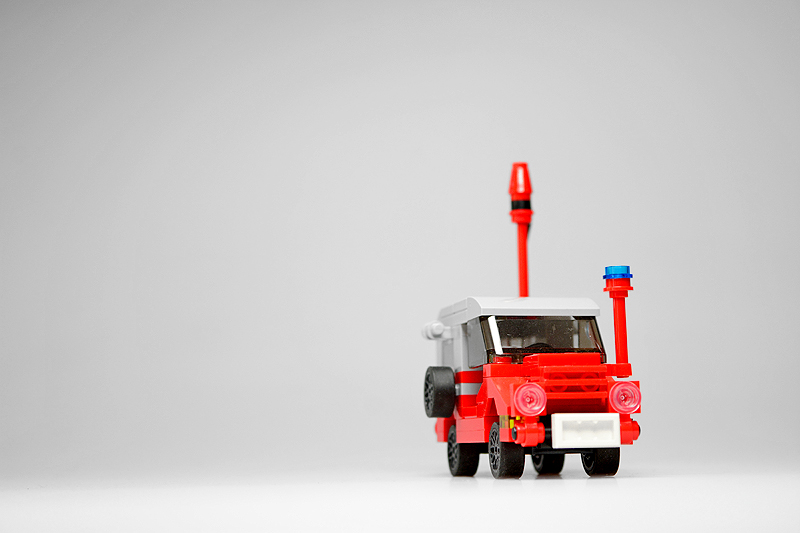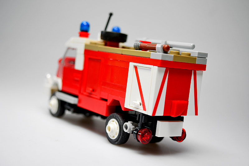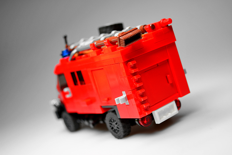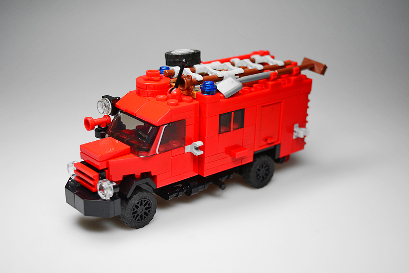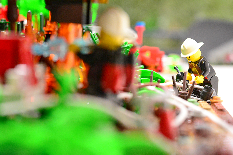 Genau diesen fehlenden Sichtkontakt wollte ich, wegen der kurzen Distanz im Modell, über einen üppigen Bewuchs am Straßenrand erreichen. Was durchaus funktioniert, wenn man sich als Betrachter auf Augenhöhe der Minifigs begibt. Jede von ihnen ist mit einer Aufgabe betreut: eine Figur kümmert sich um die Wasserversorgung, der Maschinist überwacht den Betrieb der Pumpe Im Heck des TLF 8 im Wald und an der Straße macht man sich indes für Löschmaßnahmen bereit, während der Zugführer die zuständige Leitstelle zu erreichen versucht.