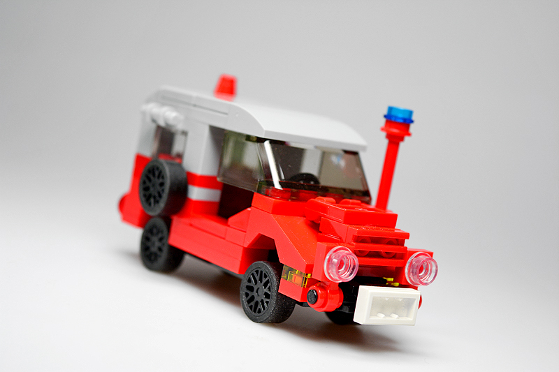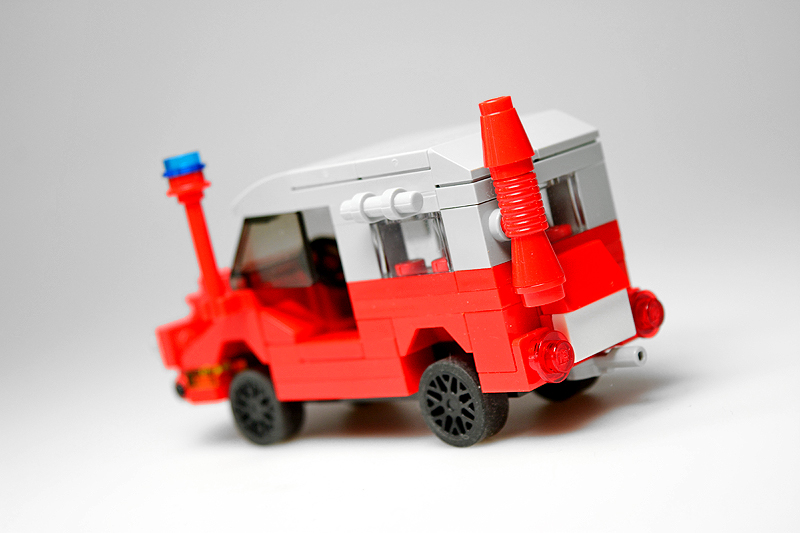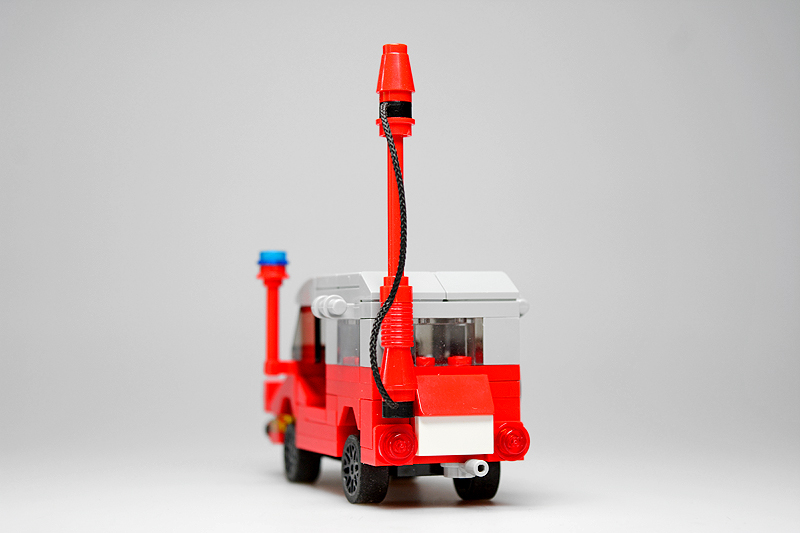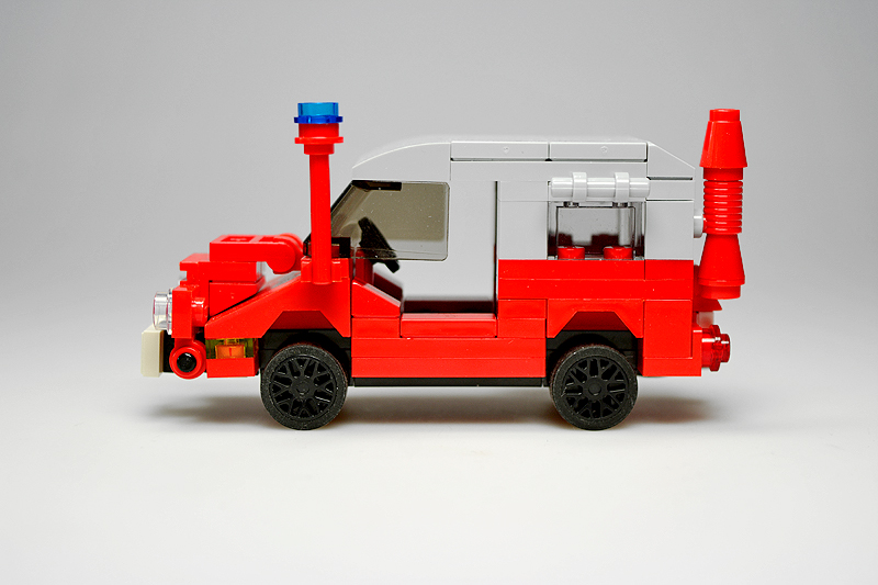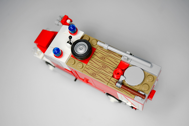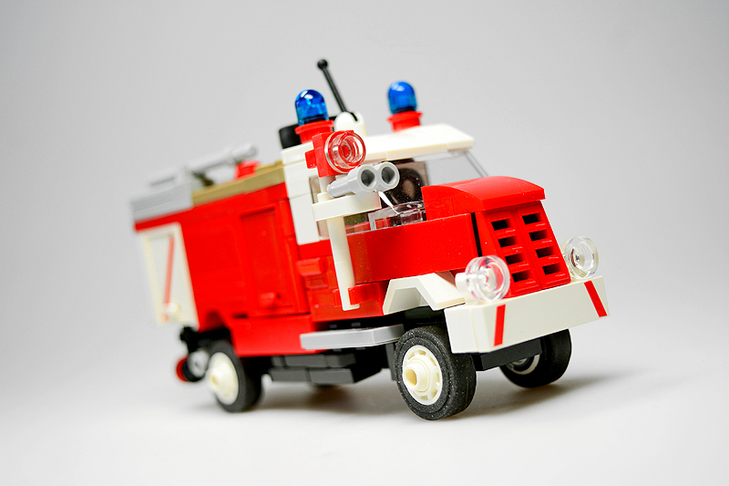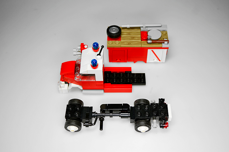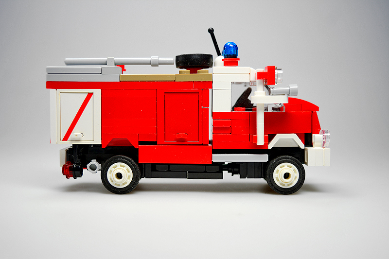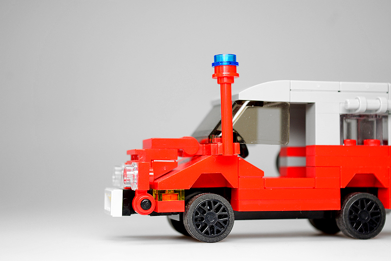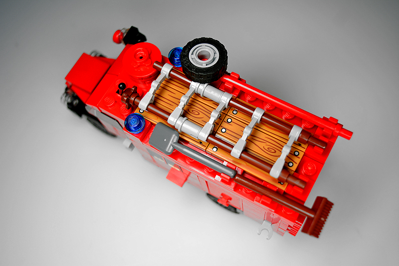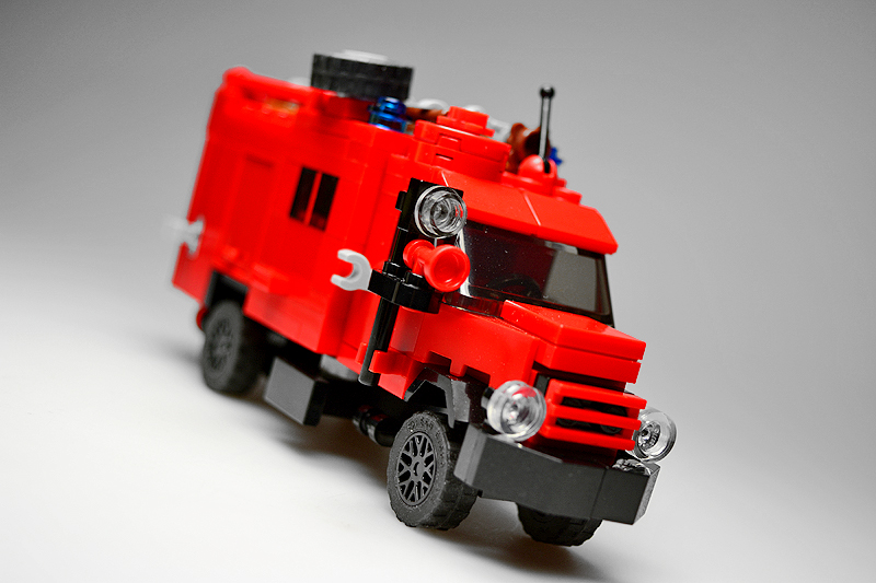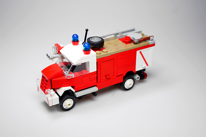 Genau diesen fehlenden Sichtkontakt wollte ich, wegen der kurzen Distanz im Modell, über einen üppigen Bewuchs am Straßenrand erreichen. Was durchaus funktioniert, wenn man sich als Betrachter auf Augenhöhe der Minifigs begibt. Jede von ihnen ist mit einer Aufgabe betreut: eine Figur kümmert sich um die Wasserversorgung, der Maschinist überwacht den Betrieb der Pumpe Im Heck des TLF 8 im Wald und an der Straße macht man sich indes für Löschmaßnahmen bereit, während der Zugführer die zuständige Leitstelle zu erreichen versucht.