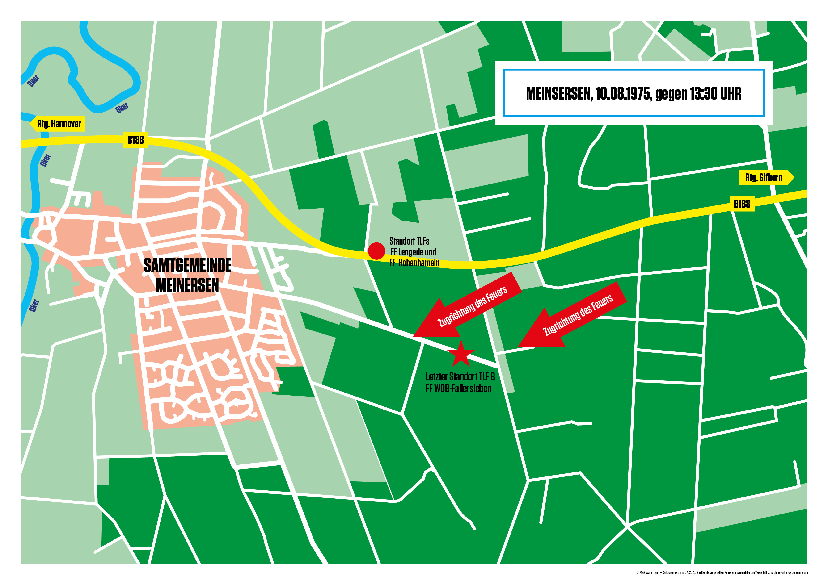 Diese Tragödie war auch die folgenschwerste während der gesamten Waldbrandkatastrophe. Das nachfolgende kleine Diorama zeigt genau jene Situation, wie sie sich gg. Mittag, kurz bevor sich der Wind folgenschwer drehte, bei Meinersen zugetragen haben soll: Die Kameraden waren gerade dabei einige Feuer, die die Ortschaft bedrohten, im Unterholz abzulöschen. Auf der Landstraße stand der Rest des alarmierten Zuges im Bereitstellungsraum oder begann selbst mit Löschmaßnahmen von der Straßenseite aus. Die Lage erschien zunächst unter Kontrolle. Ein Trugschluss.