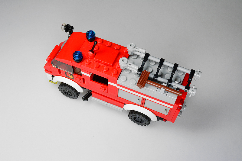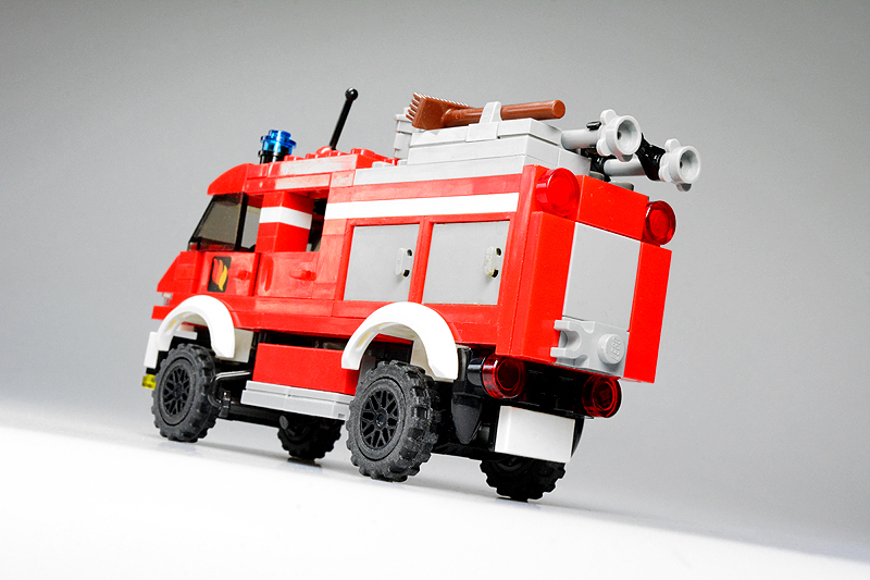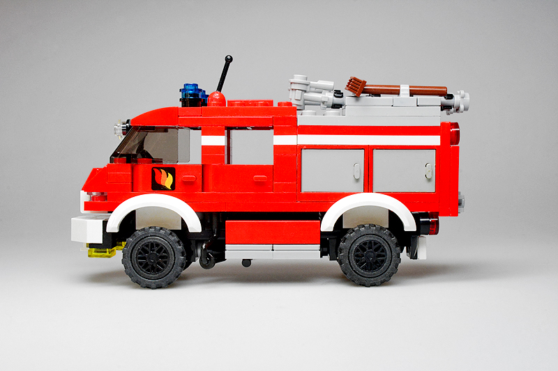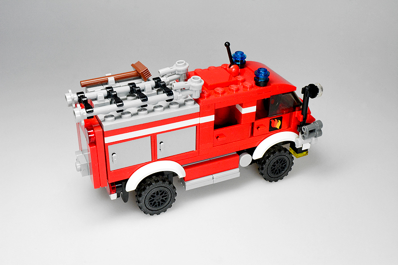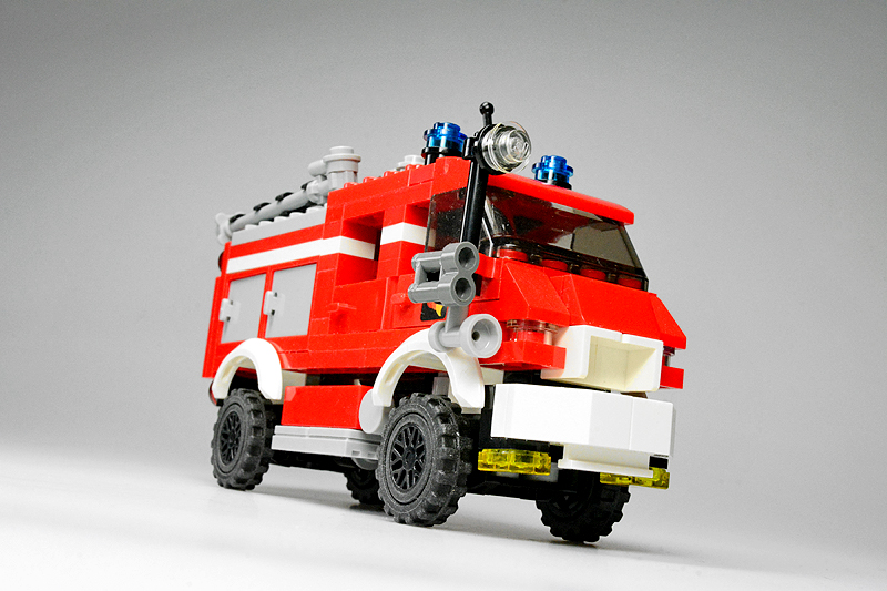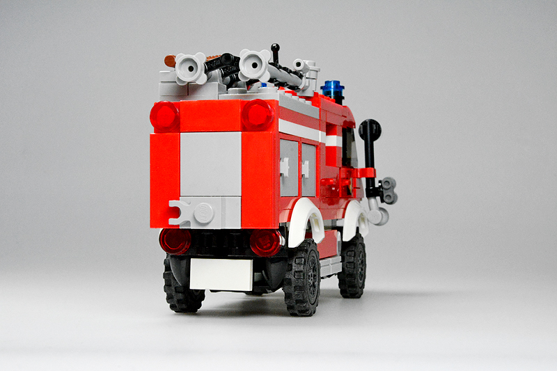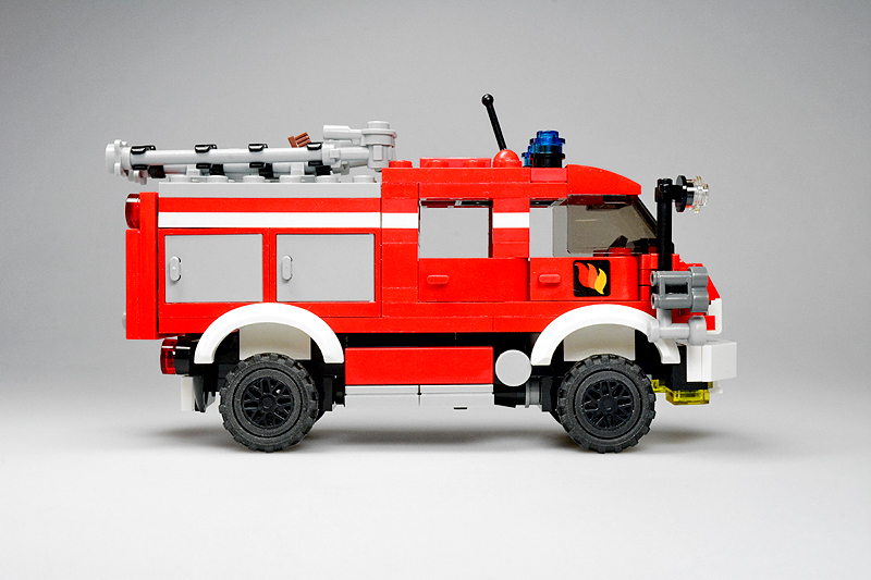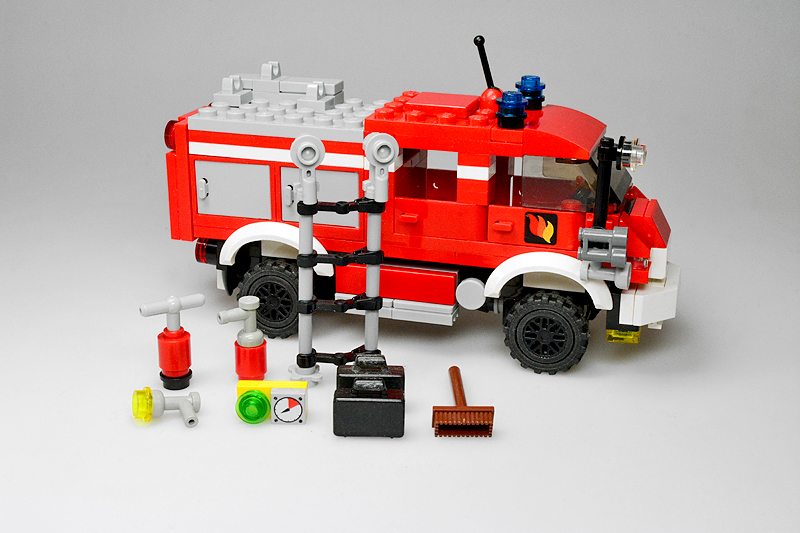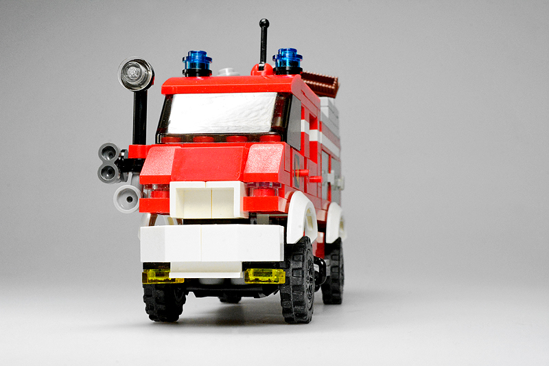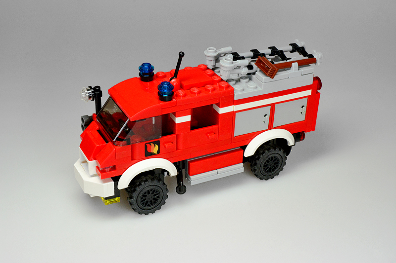 Nun, so etwas passiert, wenn einen an einem kalten Sonntagnachmittag die Baulust übermannt, folglich die Steine zu etwas zusammenklötzelt, von dem man noch gar nicht weiß, was am Ende dabei herauskommt. Zuerst hatte es kurzer Fahrerhaus und einen Aufbau mit einer Tanksektion für ein typisches TLF, dann folgte experimentellerweise eine Gruppenkabine und schließlich ein mit Cupboards bestückter Aufbau. „Dann halt ein LF 8“, dachte ich also. Allerdings schwante mir, dass alle bisher bekannten Feuerwehren (Farnheim, St. Joostersiel, Sandergast und Sande) kein solches Fahrzeug in ihren Reihen besitzen. Somit musste ich meinen „Feuerwehren im Farnheimer Umland“-Spickzettel bemühen. Und siehe, die noch ungenannte und folglich unbekannte Insel Hokkumeroog mit ihrer Löschgruppe im Ort Großedünen sollte tatsächlich ein solches Fahrzeug in der Garage stehen haben. Und so erhielt das Modell seine Legitimierung, Teil der Farnheim’schen Feuerwehrwelt zu werden. Zwar bietet die Wehr mit ihrem Erstling noch nicht allzu viel Substanz, aber der Anfang ist gemacht.
