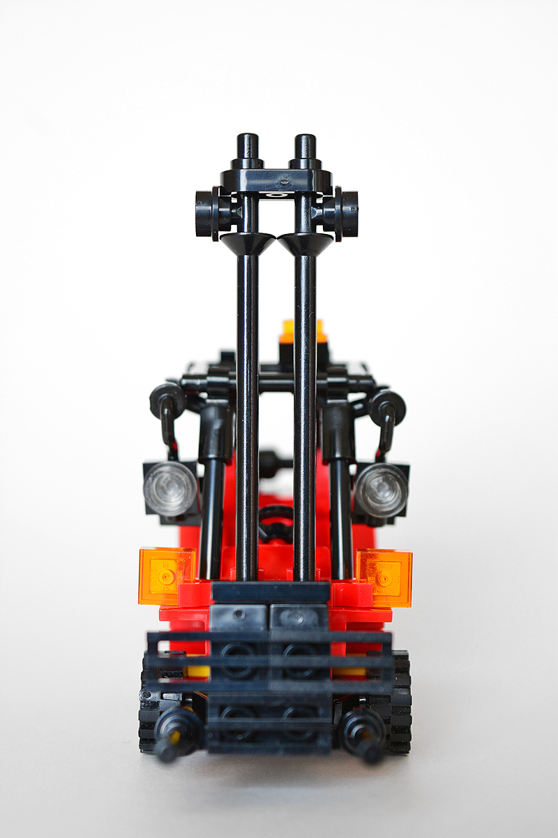 Schon länger hegte ich den Wunsch mir einen Stapler zu bauen. Bei einer Teilebörse Anfang Februar in Oberhausen konnte ich einen alten, grauen Hublift für dieses Projekt erstehen und wollte anschließend ambitioniert die Bauphase starten. Jedoch war mir schnell klar, dass dieses alte Fertigteil nicht meiner Vorstellung von Detailreichtum (Cran würde sagen „Gegreeble“ 😉 ) genügte. Also musste eine andere Lösung her. Bekanntlich ist Gurgel ja unser aller Freund, und so wurde ich schnell fündig. Allerdings sollte es schließlich kein simpler Nachbau eines Stapler eines anderen Modellbauers werden. Mein Anspruch war schon, etwas eigenes auf die Räder zu stellen. Und so betrieb ich mein persönliches Troubleshooting, in dem ich Dinge zusammensetzte und diese zunächst eine Weile auf mich wirken ließ, um sie anschließend wieder zu zerlegen und mit anderen Bauteilen neu zu kombinieren. Solange, bis ich mit den Ergebnissen zufrieden war. So sah ich bspw. als Käfig zunächst das bekannte Überrollkäfig-Formteil vor, ehe die letztlich verwendete und detailreichere aber auch erheblich teileintensivere Lösung Verwendung fand. Während das Chassis und die Karrosserie recht schnell ihre finalen Entwicklungsstand erreichten, tüftelte ich bis zuletzt an einem funktionalen Hubarm aus alternativen Teilen. Wie ich schnell feststellen musste, fand ich zunächst keine akzeptable Lösung, bei der sich die Gabel auch bis zum Boden absenken ließ. Somit benötigte die jetzige Lösung auch einige Anläufe, ehe ich auch damit zufrieden war und den Stapler in den Einsatzdienst schicken konnte.