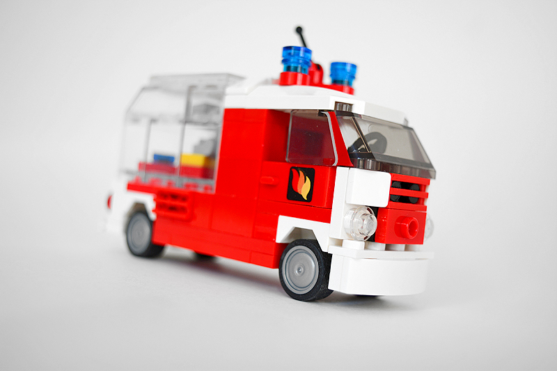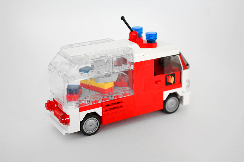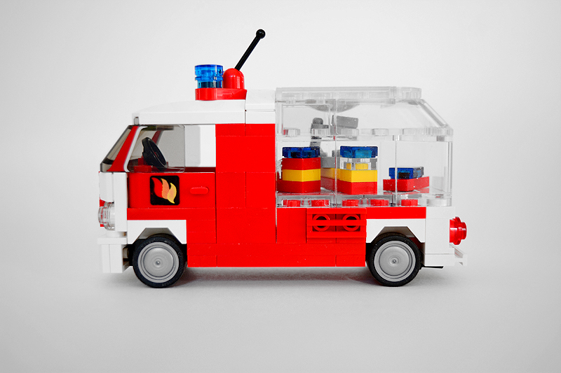 Nach wie vor ist meine Version kein präziser Nachbau, sondern vielmehr etwas Eigenes, das auf die damaligen Bedürfnisse der Farnheimer zugeschnitten ist. So wurde in der Überarbeitung der Aufbau in großen Teilen neu zusammengesetzt und ein hinteres Gerätefächersegment hinzugefügt. Gleichzeitig habe ich den vier Noppen breiten Geräteraumzugang, der hinter der Kabine anschloss, zugunsten einer Schnellangriffseinrichtung und kleinen Gerätefächern durch die beliebten Cupboards getauscht. Dabei wurde auch der Radstand um eine Noppe verlängert. Der massive Dachwerfer verschwand und wurde durch eine dem Modell in der Länge passendere Version ersetzt. Parallel erhielt das Aufbaudach aus hellgrauen Platten eine durchgängige begehbare Fläche. Anhand der diagonalen Warnschraffierung an den Fahrzeugecken und dem bekannten weiß-roten Look meiner Feuerwehr-Oldtimer soll dieses Fahrzeug optisch der Zeit-Epoche während der 1960er bis weit in die 1970er Jahre hinein leicht zuzuordnen sein. Schließlich erhielt auch die Fahrzeugfront eine kleine optische Anpassung. Aber die wechselvolle Geschichte, die ich mir damals hierfür ersann, blieb erhalten.