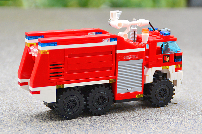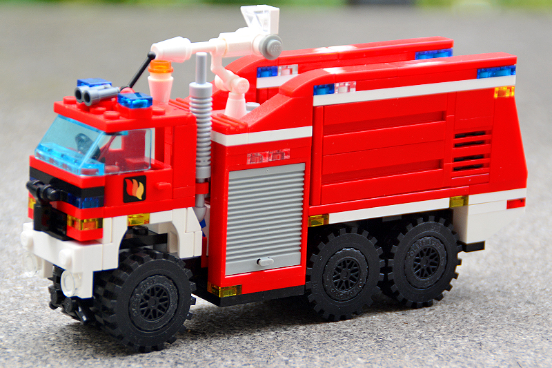Neues Jahr, neue Modelle. Jüngst habe ich mir meine Flughafenfeuerwehr als Ziel neuer Umbaubemühungen ausgeschaut. Nach ersten Fahrzeugen, die im vergangenen Jahr fertiggestellt wurden, hat nun mein erstes 6-Noppen-breites Modell überhaupt in Form dieses zweiachsigen FLFs Premiere. Es war nur eine Frage für entsprechnd plausibel wirkende Größenverhältnisse schließlich nur eine Frage der Zeit, bis ein solches Gefährt auf meinem Bautisch vorfährt. Ihr fragt Euch vielleicht, ob dies nun der Anfang vom Ende der 4w-Modelle sei? Mitnichten! Ich kann Euch beruhigen. PKWs und Kleintransporter sowie Löschfahrzeuge bleiben auch in Zukunft 4/5w breit. Es sei noch die Randnotiz erlaubt, dass TLC höchst selbst ein solch 6-Noppen-breites Ungetüm während der Classictown-Ära im Programm führte.