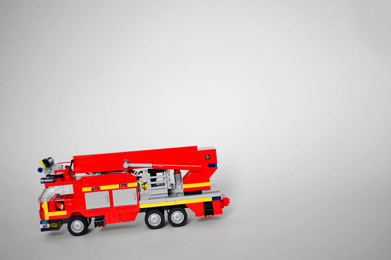 Ein solches Fahrzeug schwebte mir schon lange vor, jedoch fehlten mir (bis zur Fanwelt 2012) entsprechende Denkanstöße und bis zum letzten Stammtischtreffen in Bünde die letzten benötigten Bauteile. Nachdem ich alles zusammen hatte, begann mit dem Bau des Mastes auf Basis eines Modells aus der Feder des damaligen Ausstellers Wolfgang Köhler. Der Korb ist eine Weiterentwicklung des Rettungskorbs der letztlich vorgestellten Drehleitern, jedoch wuchs er in der Breite und bekam ein paar zusätzliche Details, wie eine Krankentragenbefestigung sowie ein Bedienpult spendiert. Um das massive Drehgestell optisch ein zu „verkleinern“ brachte ich hierbei einen Generator und etwas Werkzeug unter. Dank des winkeligen Fahrgestells konnte ich mit SNOT-Steinen eine Abstützung realisieren, die ausfahrbar gestaltet ist, und darüber hinaus noch Platz ließ einen Aufstieg auf das Podest zu gestalten. Das Erscheinungsbild des Fahrerhauses ist bewusst ein anderes, da aufgrund der Gewichtsklasse, in der sich eine solche TMB bewegt, das sog. „Familiengesicht“ nicht glaubwürdig ausgesehen hätte. Und trotz aller Fahrzeugparkvereinheitlichungen, tut manchesmal ein wenig Abwechslung an einigen Stellen durchaus gut.